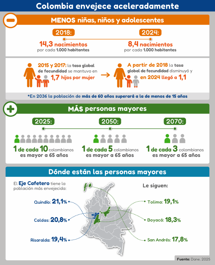 Según cifras del DANE, en 2024 los nacimientos cayeron 14% y en cinco años la caída acumulada es de 31%. La fecundidad pasó de 6,7 hijos por mujer en 1960 a 1,7 en 2017 y 1,1 en 2024. Al mismo tiempo, los avances en salud y desarrollo extendieron la longevidad, pues la esperanza de vida al nacer pasó de 50 años en 1952 a 76,6 en 2024, con una brecha entre hombres y mujeres: 79,2 años para las mujeres y 74,1 para los hombres.